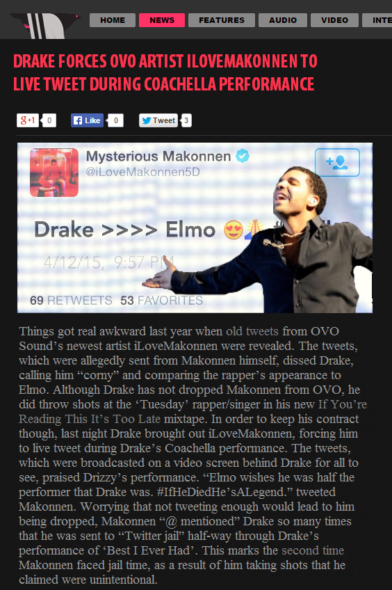 Things got real awkward last year when old tweets from OVO Sound’s newest artist iLoveMakonnen were revealed. The tweets, which were allegedly sent from Makonnen himself, dissed Drake, calling him “corny” and comparing the rapper’s appearance to Elmo. Although Drake has not dropped Makonnen from OVO, he did throw shots at the ‘Tuesday’ rapper/singer in his new If You’re Reading This It’s Too Late mixtape. In order to keep his contract though, last night Drake brought out iLoveMakonnen, forcing him to live tweet during Drake’s Coachella performance. The tweets, which were broadcasted on a video screen behind Drake for all to see, praised Drizzy’s performance. “Elmo wishes he was half the performer that Drake was. #IfHeDiedHe’sALegend.” tweeted Makonnen. Worrying that not tweeting enough would lead to him being dropped, Makonnen “@ mentioned” Drake so many times that he was sent to “Twitter jail” half-way through Drake’s performance of ‘Best I Ever Had’. This marks the second time Makonnen faced jail time, as a result of him taking shots that he claimed were unintentional.
